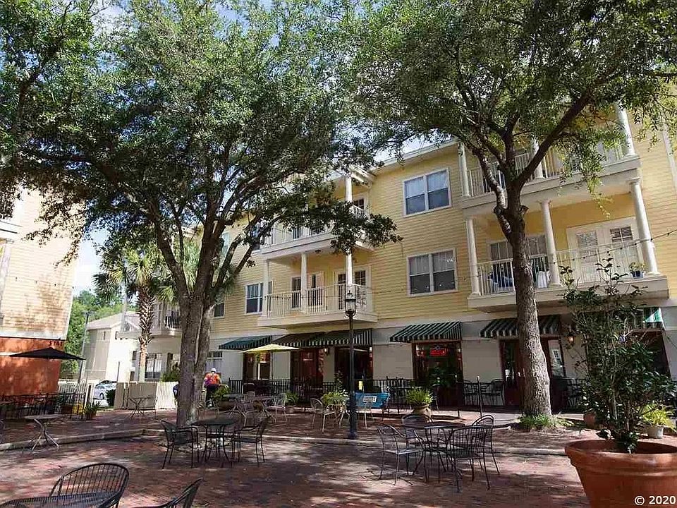 Welcome to this bright and spacious 2-bedroom, 2-bath condo located in the heart of Haile Plantation Village Center. This top-floor unit features vaulted ceilings, abundant natural light, and a private balcony. The open kitchen offers quality cabinetry, full appliance package, and a breakfast bar overlooking the dining area. Both bedrooms provide ample closet space, and a built-in desk nook is located just outside the primary suite. Additional conveniences include in-unit laundry and access to community amenities such as a pool, clubhouse, and fitness center. Perfectly situated above popular dining and retail spots with walking access to shops, restaurants, weekly farmers market, and scenic trails. The Route 150 bus stop is just steps away for easy commuting to UF, Shands, and surrounding areas.
