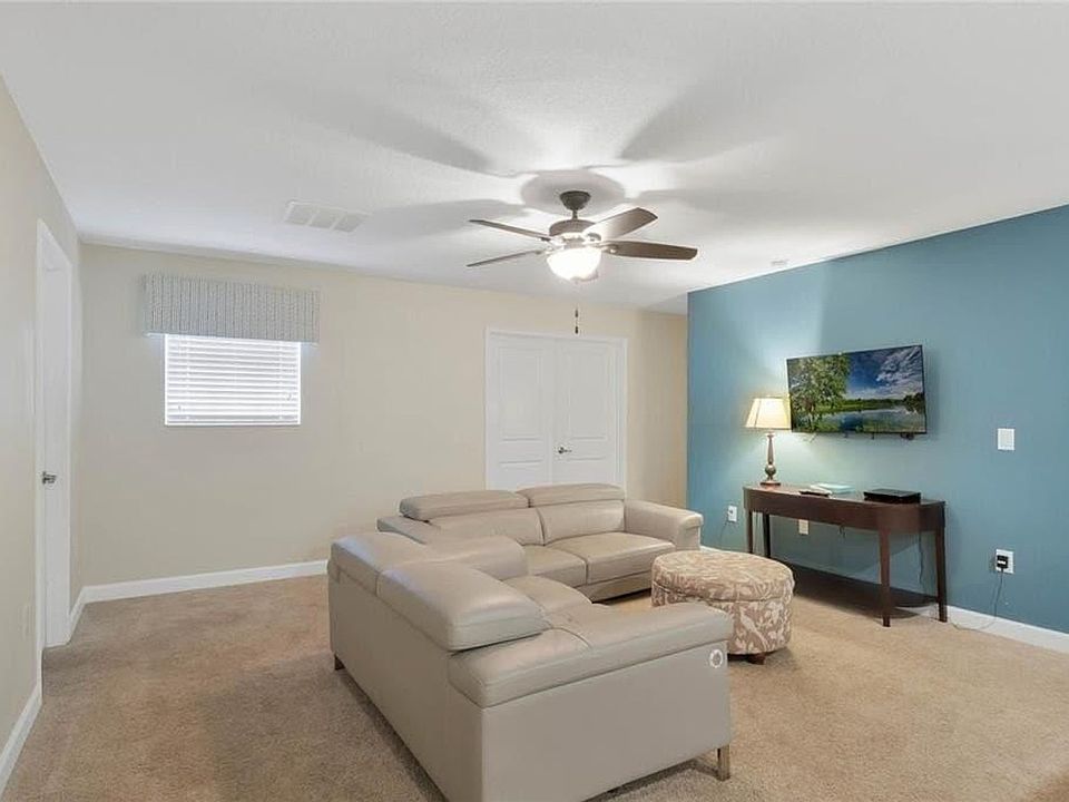 Feel at home in this extra-large 8-bedroom, 5-bathroom villa, featuring a light and airy color palette that fills the space with crisp and relaxing tones. The Florida feel is evident throughout, from the finished game-room garage to the Hollywood Sign movie theater room. The villa boasts a clean and large open floor plan that promotes togetherness and relaxation, extending into a spacious kitchen and dining area. The bedrooms are big and bright on both the first and second floors, with tasteful decorations and ample storage. The kitchen is highlighted by stainless steel appliances, a tile backsplash, and an oversized breakfast bar for extra seating. A large dining table with well-accented lighting overlooks the massive pool. The first floor includes a master bedroom and another large bedroom, perfect for those seeking single-story vacationing. The back of the home features a covered lanai, a child protection fence, and a large pool with plenty of space for entertaining and soaking up the Florida rays. The villa is designed for entertainment, featuring a custom movie theater room and a game room. The kitchen is fully equipped with modern appliances, including stainless steel fixtures and a tile backsplash. The oversized breakfast bar provides additional seating, making it perfect for gatherings. Smart TVs are available in all rooms, ensuring entertainment is always at your fingertips. Pool spa heating is available for a fee of $40 per day with a 2-day minimum, and arrangements should be made prior to arrival. A small 18-inch charcoal grill is provided free upon request, while a propane/gas grill is available for $30. The driveway accommodates 2 to 3 cars, with overflow parking available 250 ft away. A maximum of 5 cars can be registered. Only small pets or dogs under 40 pounds are allowed with a $150 pet fee per animal. Legal service dogs are exempt with proper documentation. Any damages or extra cleaning caused by pets will incur additional charges. Located just minutes from Disney, shopping, restaurants, grocery stores, and major highways, this villa offers convenience and accessibility. The Champions Gate Oasis Clubhouse is nearby, offering a waterpark, food court, activity center, multi-million dollar pool and clubhouse, lazy river, cabanas with AC, sand beach volleyball court, fitness area, onsite movie theater, full-service restaurant, rentable conference center, ample parking, and a tiki bar at the pool. Golf enthusiasts will appreciate the proximity to the Champions Gate Country Club Golf Course. Champions Gate does not allow events, and no parties are permitted. Linens and towels are provided at the start of your stay, but washcloths are not included as they are considered personal items. The property is managed by a trusted partner, and the accommodation staff speaks Portuguese, Spanish, Turkish, and English. Guests will have access to the entire house. Check-in and check-out times should be arranged with the management team.