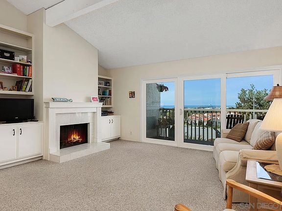 Panoramic sit down ocean & sunset views from living area, balcony & primary bedroom! 2 story townhome style unit with no one above or below! Detached one car garage just steps from the front door, with addl unmarked spaces close by. Enter on the main living area with kitchen, 1/2 bath, dining area, & living area with fireplace, built-ins, high ceilings, & deck/balcony views of the ocean. Downstairs are 2 bedrooms, 1 with under stair storage, each with en-suite bathroom, & full size laundry closet. Located just east of the 5 fwy, just north of Poinsettia, & just west of Paseo Del Norte. Note: HOA fee includes ALL water, including Hot Water, via common boiler at end of bulding.