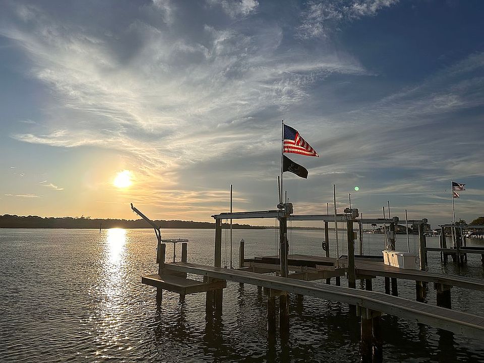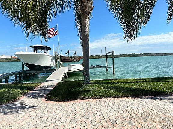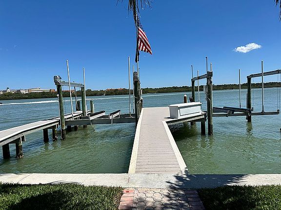 True boaters paradise featuring a double composite boat dock with 2 lifts capable of accommodating a 16,000 lb and a 8,500 lb boat, along with davits, a convenient SUP/Kayak launch area and a fish cleaning station. This premier homesite offers direct waterfront access, great for boating enthusiasts with 88ft of water frontage and less than 1 mile to Gulf access at Johns Pass.