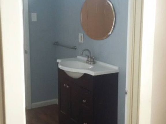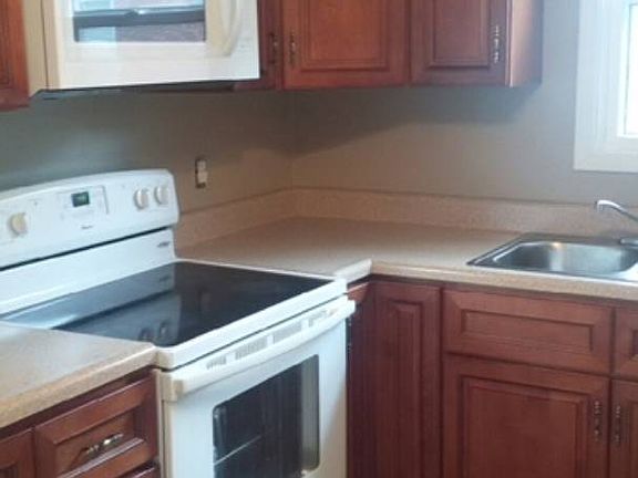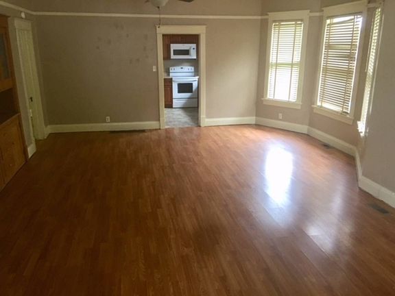 Entrance: Open front porch Living Room/Dining Room: This huge room has laminate floor freshly painted walls. Built in china cabinets. Walk in bay window area in dining room Bedroom: Large closet, freshly painted walls, spacious hard surface floor Bath: Located between the two rooms. Updated vanity and wall enclosure for tub. Fresh paint Bedroom: Large room with two closets. Hard surface floor. Kitchen: All new maple cabinets, new counter top and sink. White appliances. Smooth top range. Nice vinyl floor. New window. Breakfast room: Sunny breakfast room has new walls, and new vinyl floor to match kitchen. Presently used as a laundry room at one end of this breakfast room. But there is plenty of space in basement for laundry. Basement: Large basement has a finished bedroom with walls, ceiling and carpet. Other area for storage holds water heater, gas forced air furnace, central air.