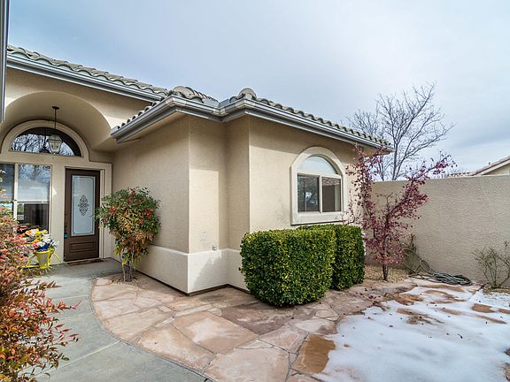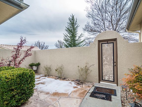 This home has received a new coat of Paint inside and is ready for a new owner. The bedrooms have their own bathroom and the office has a door to exit to the side yard. Property is fenced and cross fenced and is very inviting for pets. There are several nice sitting areas on the property to enjoy the views and privacy.. Big covered back patio with great views of SF peaks. Private fenced front courtyard. Fantastic az room off the master bedroom that could be a game room. Nice kitchen with granite counter tops, roll outs in cabinets, and an island with a pot rack above. Pass thru window from kitchen to back patio. Vaulted ceilings, open floor plan, spacious laundry room and built in cabinets for storage in the garage. Fully landscaped with fruit trees in the back yard.