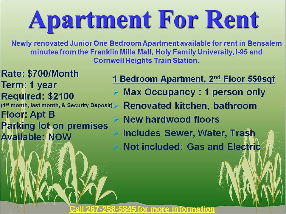 MAXIMUM OCCUPANCY of this unit is 1 PERSON ONLY MAXIMUM OCCUPANCY of this unit is 1 PERSON ONLY MAXIMUM OCCUPANCY of this unit is 1 PERSON ONLY Newly renovated Junior One Bedroom Apartment. It is minutes from the Franklin Mills Mall, Holy Family University, I-95 and Cornwell Heights Train Station. Apartment features a New Kitchen, Updated Bathroom, Hardwood floors throughout the apartment. Private parking located in the rear and nice size shared back yard. Why live in a complex when you can have the feel of living in a home? Property Information: **MAXIMUM 1 PERSON OCCUPANCY ONLY** **MAXIMUM 1 PERSON OCCUPANCY ONLY** $2100 upfront - first, last and security deposit. Rent amount - $700, Security deposit - $700 Required: Credit Check, 2 Paystubs, 2-3 References, Employment Verification Date available - NOW Utilities included - Trash, Sewer, Water Utilities not included - PECO (Gas and Electric through PECO) / Cable Parking - Back yard Laundry - Not Included, Laundromat is around the corner Square footage - 550 sq fet Second floor of a duplex Bedroom: 1, Bathroom: 1 Kitchen - large updated kitchen Backyard- shared backyard Pets OK under 25lbs for additional fee - Fee is $300 due upfront Newly renovated Junior One Bedroom Apartment. It is minutes from the Franklin Mills Mall, Holy Family University, I-95 and Cornwell Heights Train Station. Apartment features a New Kitchen, Updated Bathroom, Hardwood floors throughout the apartment. Private parking located in the rear and nice size shared back yard. Why live in a complex when you can have the feel of living in a home? Property Information: Max Occupany of this unit is 1 person $2100 upfront - first, last and security deposit. Rent amount - $700, Security deposit - $700 Required: Credit Check, 2 Paystubs, 2-3 References, Employment Verification Date available - NOW Utilities included - Trash, Sewer, Water Utilities not included - PECO (Gas and Electric through PECO) / Cable Parking - Back yard Laundry - Not Included, Laundromat is around the corner Square footage - 550 sq fet Second floor of a duplex Bedroom: 1, Bathroom: 1 Kitchen - large updated kitchen Backyard- shared backyard - Pets OK under 25lbs for additional fee - Fee is $300 due upfront Pictures: Available Upon Request Max Occupany of this unit is 1 person $2100 upfront - first, last and security deposit. Rent amount - $700, Security deposit - $700 Required: Credit Check, 2 Paystubs, 2-3 References, Employment Verification Date available - NOW Less