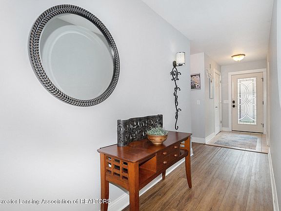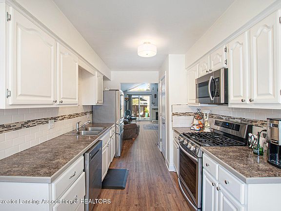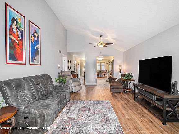 Welcome to this beautifully maintained 2-bedroom, 2.5-bathroom condo, offering spacious living in a prime location. The open-concept living area features soaring high ceilings and a cozy gas fireplace that creates a welcoming atmosphere. Step outside through the walkout slider to your private back deck, perfect for enjoying peaceful outdoor moments. The galley-style kitchen is a chef's dream with plenty of counter space, modern appliances, and an eat-in dining area overlooking the front yard. A generously sized pantry provides extra storage, making meal prep a breeze. The main floor features luxurious vinyl plank flooring throughout and a convenient primary suite with a full attached bathroom for ultimate privacy. An additional bedroom and half-bathroom complete the main level, providing ample space for family or guests. Head downstairs to the partially finished basement, where you'll find a recreation room perfect for unwinding or entertaining. A full bathroom is located on this level, along with a bonus room, ideal for an office or home gym. You'll also appreciate the expansive utility room, offering plenty of extra storage. In addition to the beautiful living space, this condo comes with a 2-car garage, providing ample parking and storage options, offering peace of mind and enhancing the property's value for years to come. Located just minutes from shopping, highways, and downtown Lansing, this condo offers both comfort and convenience. Don't miss out on this fantastic opportunity, schedule your showing today! (HOA dues reflect Capital Improvement Project that will drop off after June 2026 and will go to $285 a month.)