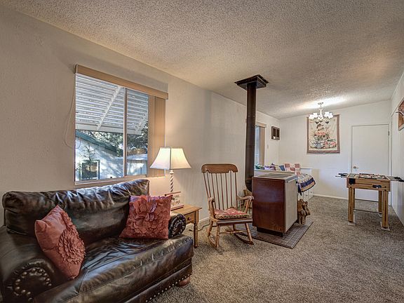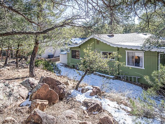 Cottage Swiss-style home in the trees, near Highways 260 and 87 in the well-established Payson North community; close to everything in Payson! Cozy 2 bed, 2 bath manufactured home with lots of storage cabinets in the kitchen and separate dining area and master bedroom, with full laundry room off the kitchen. The one-car covered carport has stairs accessing side of the home, long driveway for additional parking and room for RV parking to the right of the carport. There are three storage sheds on the property, one with a workbench. The home sits on a beautifully treed lot with a greenbelt in the back -- relax and enjoy elk and other wildlife that are seen often in this area. MORE This is a landscaper's blank slate to complete, with stairs leading up either side of the back yard to the lovely greenbelt. The roof was replaced in 2016 and a new water heater added in 2019. Entry/family room and second bedroom area addition on west side of home was done in the late 60's, no permit records available from that time frame, and no permanent heat source in the addition. Woodstove located in the family room portion of the addition for ample heating. Forced air propane heats the rest of the home.