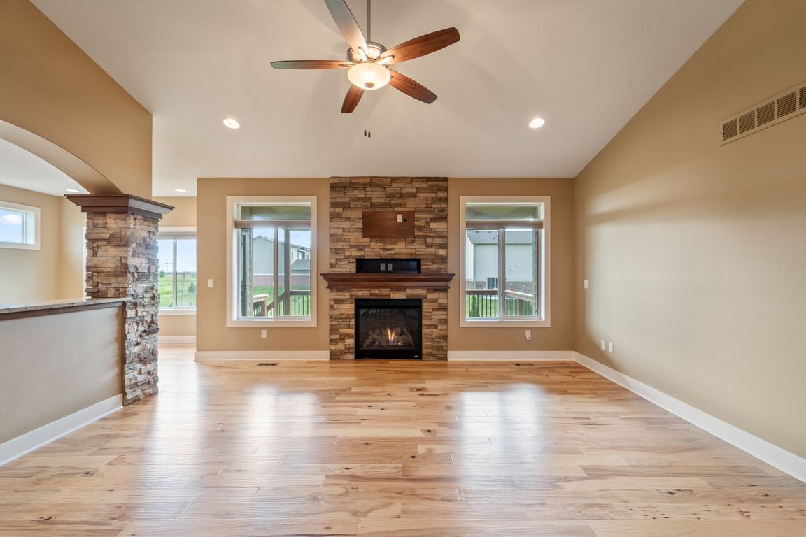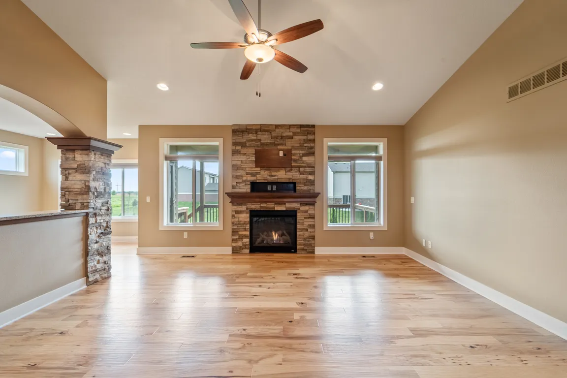 Wet barFinished basementStriking stone archwayStunning ranch-style homeCovered deckCozy inviting atmosphereClassic maple cabinetry