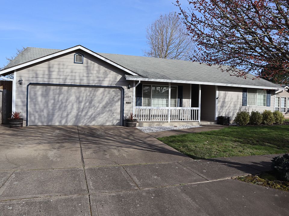 This lovely one-level ranch has an inviting front porch that brings you into the living room with vaulted ceilings and laminate flooring throughout. Updated kitchen with granite counters, stainless steel appliances, pantry & peninsula overlooks dining area. Master bedroom with bath and walk-in closet. Finished garage. Private, fenced back yard with patio and an apple tree! Heat pump, newer furnace, and hot water heater.