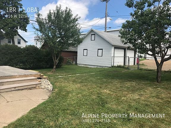 Call today to schedule a tour of this newly updated 1 Bed/1 Bath ground floor duplex apartment for rent at 916 W. 12th St.! This unit was recently updated and has tons of great amenities including central air and garage parking! There are two private entrances, one of which leads out to the back deck and fully fenced in yard. The north garage stall is included with rent. The eat-in kitchen was recently with brand new cabinets and comes equipped with refrigerator, microwave and stove. The bathroom is very roomy and was also updated with new tub surround, sink/vanity and toilet. - $65 application fee per adult - $720 security deposit - Pet friendly(2 max, breed restrictions and fees apply) and non-smoking - Lawn/snow care included with rent! - Tenants pay gas, electric, water and garbage - Alpine Benefits included for $25/month extra (see website for full details) - Section 8 accepted if your voucher meets the marketed rent amount Professionally leased and managed by Alpine Property Management Back Deck Cental Air Garage Parking Included Ground Floor Unit Lawn/Snow Multiple Private Entrances Non Smoking Online Tenant Portal Pet Friendly Shared Fenced In Yard Stove Tub Shower