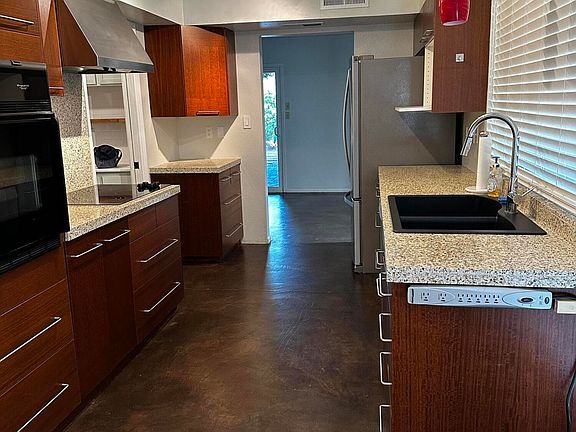 Contemporary touches make this North Central home a great find. Interior flooring is stained concrete, updated bathrooms, stainless steel appliances, large walk in pantry, convection oven, large indoor laundry room with tons of storage, hidden closet behind a bookcase, pavers in a private, lush, low maintance patio/backyard. Primary bedroom has walk-in closet and easy step-in en-suite tiled shower. Lock and leave house in a quiet neighborhood just across from the community pool, spa and clubhouse.