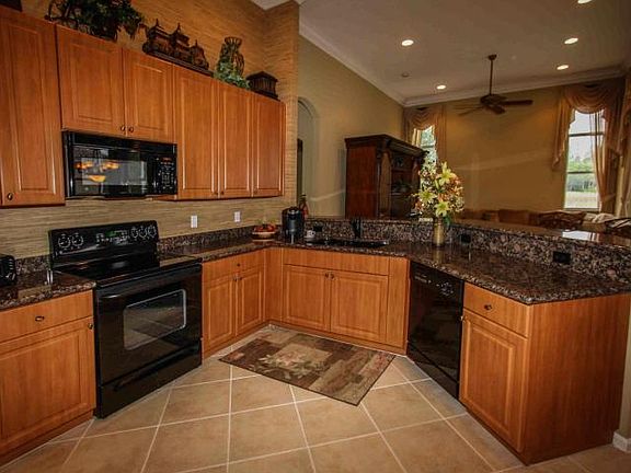 3 BR/2.5 BA Celestia on lushly landscaped property. Shows better than a model. Enter through elegant double doors into foyer leading to open floor plan with diag tile in all living areas. Kitchen features 42'cabinets w/granite and upgraded appliances. Caf area opens to large family room w/sliders from F/R & L/R opening to ext screened patio overlooking large lake & preserve. Very private with no rear neighbors. Master bedroom suite features large his & hers walk-in closets, and bathroom with dual vanities, separate shower and Roman tub. Third bedroom being used as den. Crown molding, cent vac, Intercom. Newly refurbished 36,000 sq ft clubhouse has grand ballroom offering professional entertainment w/professional sound system. Heated, salt-water,resort style indoor and outdoor pools, cafe