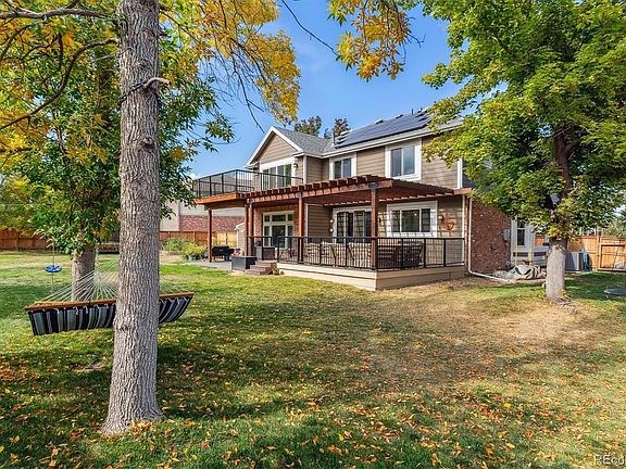 Nestled in the highly sought-after Hillcrest neighborhood in the heart of Highlands Ranch, this extensively updated home offers something for everyone. The interior boasts numerous improvements, including new carpet, fresh paint, and durable wide plank flooring throughout the main level. The completely remodeled kitchen features new 42" white shaker cabinets, counters, appliances, and a convenient walk-in pantry. New trim and 4" baseboards add a touch of elegance, while the remodeled laundry room enhances functionality. The home's ambiance is elevated w/ all-new interior lighting and ceiling fans, complemented by new windows for enhanced energy efficiency. The spacious primary suite impresses with a newly added door leads to an upper backyard deck, perfect for enjoying the Colorado sunshine. The primary bedroom also showcases a sitting area and a cozy 3-sided fireplace, along with an updated bathroom featuring new cabinets and a custom closet. Two bedrooms with custom closets share a Jack and Jill bath, while a fourth bedroom boasts its own private bathroom. The finished basement includes a 3/4 bathroom, guest bedroom, and ample storage, including a converted crawl space. Outside, the massive .41-acre yard is a playground paradise, featuring a zipline, playhouse, oversized irrigated garden, large storage shed and chicken coop, with plenty of space for additional amenities like a pickleball court. Recent exterior improvements also include a newer deck, patio, pergola, professional landscaping, updated roof and gutters, new furnace & AC, fresh exterior paint, and a new front door. Why pay a power bill when you have a 100% owned (no lease) new solar panels with the max 240kw output, save $100's every month! As a resident of Highlands Ranch, you'll enjoy access to 4 recreation centers offering a wide range of activities, from fitness equipment to swimming pools and pickleball/tennis courts, as well as miles of accessible gravel and paved trails for outdoor enthusiasts