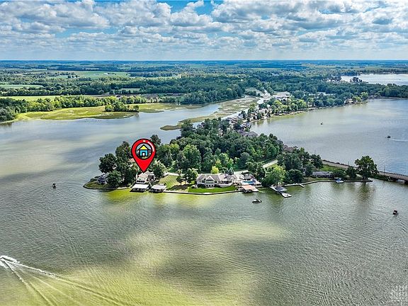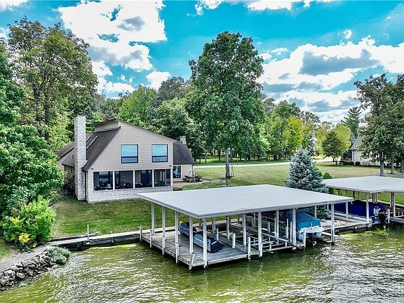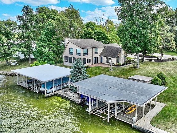 Luxury Lake Living...remarkable residence situated on fantastic waterfront lot in Lakeridge Isle surrounded by lush landscaping, shaded by mature trees and providing stunning panoramic open water views.Boasting 95' lakefront along calm waters for swimming,fishing & boating with power lifts to 3 covered boat docks.Well appointed layout lends itself year-round living or weekend retreat.Vaulted & beamed great rm highlighted by floor to ceiling stone hearth of WBFP flanked by beveled glass windows w/ arched transoms & large picture window with walk-out to paver patio ideal for entertaining. Breakfast bar seating into open concept kitchen plus formal dining space. 29x12 enclosed patio rm accessible from dining, patio & owner’s suite boasting paver floor w/ drains, electric & 2nd WBFP with ample seating and dining areas. Conveniently located 1st fl owner’s suite plus