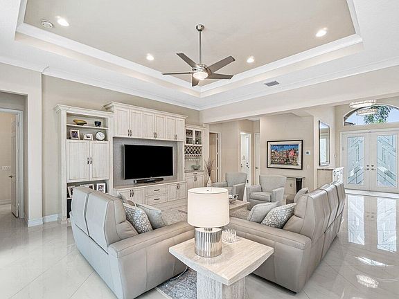 FULLY FURNISHED - Please call for furniture Inventory. Gorgeous Julia model with 3 bedrooms + den, 3.5 baths and a private yard. Upgrade highlights include: Custom etched glass entry front doors, fabulous kitchen and bath upgrades, 24x24 porcelain tile in living areas, laminate flooring in BR 2 and BR 3, built-in wall units in the great room, Master, Office 1 (BR2) Office 2(Den), and the foyer, High-end window treatments and fixtures/fans, built-in closet systems, tons of high hats, Crown molding, Upgraded washer and dryer, gutters, accordion storm shutters, 2020 Carrier A/C, and so much more. Valencia Reserve is a top 55+ community with tons of amenities. HOA Fee includes exterior painting of house, lawn care, alarm monitoring, cable and internet!