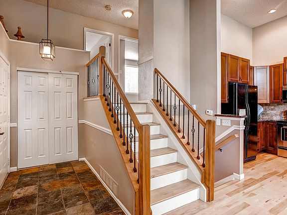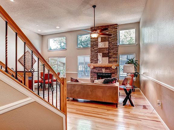 Stunning bright & open floor plan with custom features & upgrades throughout. Perfect layout for entertaining! Living room with soaring ceilings & custom stone fireplace. Gourmet kitchen upgraded with chiseled granite countertops, double stained cherry cabinets, newer appliances & travertine backsplash. Eating space with slate tile flooring. Hickory hardwood floors throughout main level & stairways. Lower level master suite includes sitting area with built-in shelving & full remodeled bath. Upper level with two spacious bedrooms & full bath. Brand new carpet. Bronze fixtures throughout & canned lighting. Stamped concrete patio with pergola surround & water feature opens to the private backyard with hose hookup water system. 2-car attached garage with new garage door. Newer roof (2yrs), Air Conditioning (4yrs), furnace & hot water heater (4yrs). Centrally located with easy access to main thoroughfares, shopping & restaurants. Close to parks, trails, open space & schools.
