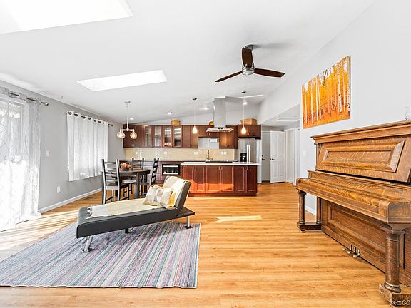 Inviting elegance radiates through this Lakewood residence. Residents are welcomed into a modernized layout illuminated by abundant natural light and freshly painted soft grey wall color. An open kitchen, living and dining area provide a seamless flow for at-home entertaining. The home chef is treated to stainless steel appliances, plentiful cabinetry, granite countertops and an expansive island w/ seating. A touch of warmth is added by a gas fireplace in the living room, creating the perfect ambiance for relaxation. Meander outdoors to find a sizable patio — the perfect setting for enjoying dining al fresco. Retreat to a spacious primary bedroom w/ a private bath featuring vanity storage plus walk-in closet. One additional main-level bedroom provides flexible living and is complemented by a full bath. Downstairs, a finished basement awaits w/ brand new plush carpeting plus a third bedroom with egress window, ¾ bath, and plentiful storage space. Large basement laundry room includes washer, dryer and utility sink. Residents enjoy close proximity to 6th Avenue and plentiful shopping + dining options at Belmar Shopping District.
