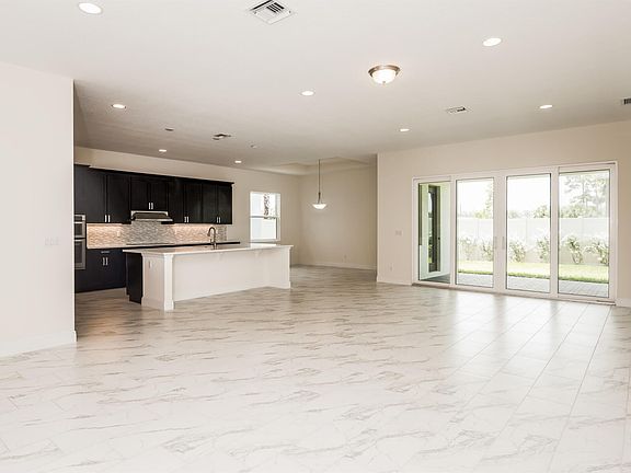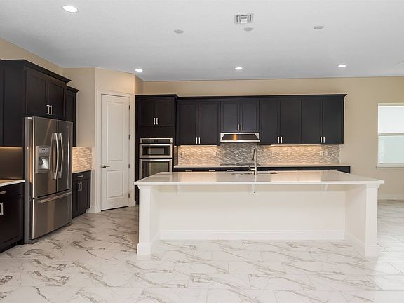 Functional and beautifully designed single-story home features an open gourmet kitchen with upgraded cabinets, designer backsplash, quartz counters and double ovens. Upgraded 12" x 24" tile in all main living areas. Covered lanai has outdoor kitchen.