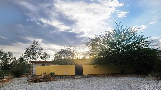 "Rock Climbers' Haven" Here is a stylish home set back from the road with many privacy features yet neighbors close by. It is only 20 miles from Palm Springs. Many residents who want to be a bit cooler (elevation approximately 1800'), want horses and starry skies commute from here south to Palm Springs. Joshua Tree National Monument is 20 miles north. Courtyard surrounds front and side of the house. On a rectangular and ample .62 acres, the back,about 1/2 of the area is completely fenced. In the back there is an Ampitheater- type indentation carved out for fire pit gatherings. Back yard has slabs ready for desert gardening or enclosed patio. Front yard is graveled and has two entries for parking. Fountain and private side deck highlights zen like courtyard. New exterior paint and new roof. Slab in back yard for shed. Interior has slate floors throughout. 2 baths have Kohler fixtures. Separate dining room and slider out to deck. Prime to add your modern touches and upgrades. Laundry area has standard size washer and dryer.