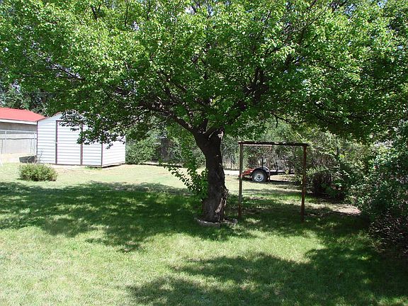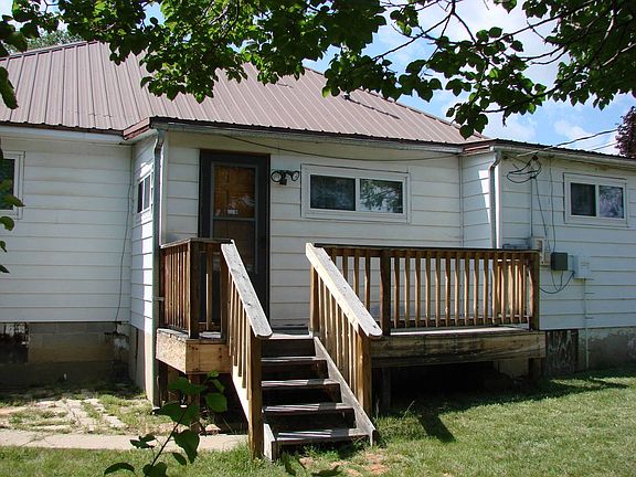Metal siding, metal roof, newer Windows. Wood deck. Covered front porch. Storage building. Mature trees, shrubs, rosebushes.