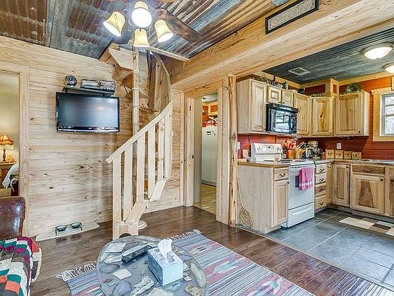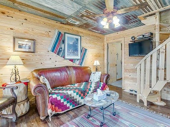 Enjoy the view of the carefully planted Texas Native grasses and wildlife from this adorable custom log style home. This home can be used to raise your livestock, hunt or a great week end retreat! Home has 2 storage sheds, 1 with new windows can be used as playroom. Pasture has loafing shed and chicken coop and pond. New carpet downstairs. Large utility room with lots of storage also has shower,sink, toilet. Storage or workshop has electricity. BUYER WILL NEED NEW SURVEY