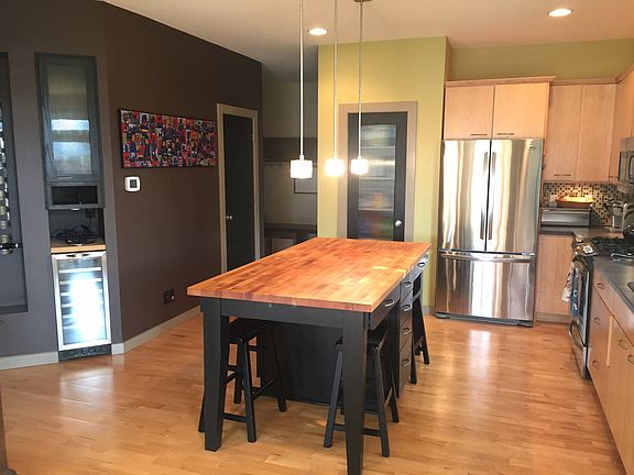 Contemporary home, maple hardwood, designer colors & finishes, bright, soaring ceiling in living room, master suite with tray ceiling, large closets, wine rack & fridge, glass shelving, generous laundry room, eco-friendly Marmoleum, heated floors and triple-headed shower heads in master bath, contemporary tile, hard-wired two station sound system with outputs for the south patio, fenced back yard for pets, large green space and patio
