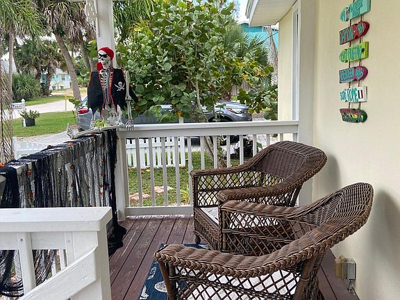 Beach Bungalow in New Smyrna Beach! Home is available for an annual lease only. This fully furnished 2 bedroom 2 bathroom home is located within a 4 minute walk to the ocean on a quiet residential natural crushed shell street. The home has a very nicely updated kitchen including granite counter tops, stainless appliances, and light wood cabinets. Beautiful original hardwood floors throughout. The queen size master bedroom with a TV also comes complete with a full ensuite bathroom. The second bedroom with a TV has 2 comfortable twin beds, with the full second bathroom in the hallway. Listen to the ocean waves on quiet peaceful nights and feel ocean breezes on the front porch, or spend time on the huge rear brick paver patio with pergola and dining table overlooking the tranquil backyard and outdoor shower.