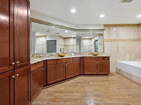 New refrigeratorStainless steel appliancesGranite countertopsSoaking tubKitchen with large islandDouble sinksWalk-in shower
