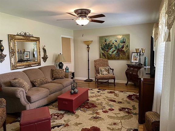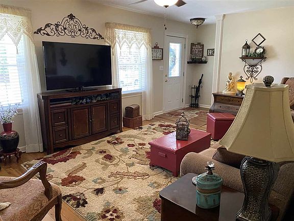 Charming and delightful home with many seller improvements and updates "ready to move into" condition! One story brick with lead glass door entry. Original hardwood floors, this can be split three bedrooms, seller using one bedroom as a family room. There are two baths, one adjoining a bedroom, second bath is updated with elevated double sink vanity, vinyl plank floor. Dining area in kitchen with built in corner cabinet, newer appliances. Fireplace in family room, door to outside chain link fence area for pet. Newer windows and outside doors. Seller added concrete driveway and pad to a 24 x 24 pole barn (Man Cave) plus there is an oversize yard barn. New fiber optic cable for high speed internet. Pretty landscaping!