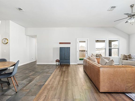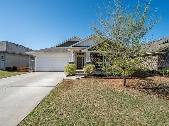 Feels like home the moment you walk in! This home boasts true four bedrooms, newer roof (replaced in 2021), an open concept, wood flooring in living room and hallways, tile flooring in the kitchen,dining, laundry and bathrooms, a split floorplan offering more privacy. The kitchen features a new microwave, quartz countertops, apron sink, shaker-style cabinetry, pantry, and an island with a breakfast bar. In the primary bedroom you will find an ensuite with double sink vanity, garden tub, separate shower with white subway tile, and access to the walk-in closet. Enjoy outdoor living with a covered porch, covered patio, and a fully fenced backyard with a privacy fence. Located in the Greenleaf Trails community, which offers playgrounds, splash pads, pollinator gardens, and fitness trails. Approximately 2 miles to I-35 access and only a short drive to OU campus, local parks, Norman Regional Hospital, dining and shopping options. Your future home is just a showing away!
