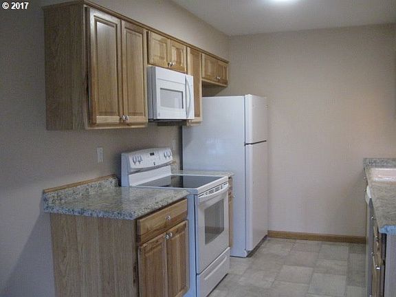 Newly remodeled, Cabinets, Floors (wood,vinyl and carpet), paint, New appliances,Range, dishwasher, microwave, refer, and water heater. New Single garage door with new opener,Laundry room in garage. Living area is upstairs. Balcony under trees. Peaceful and quiet unit. Lots of green space and a community building with lots of extra parking. H. O. A. Will paint the garage door and do minor repairs to front of Condo.