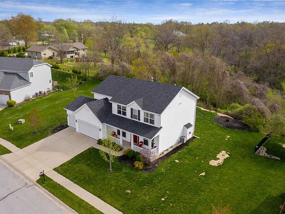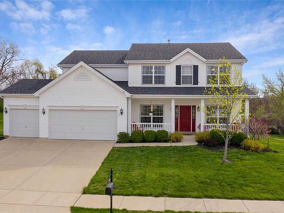 Wonderful, open on the main, 2 story, 4 bed, 3 bath home, on a quiet cul de sac in The Woodlands at Far Oaks in O'Fallon Dist 90! Light filled foyer opens to living rm/office & to dining rm, and leads to large family rm w/window bay and fireplace. The family room opens to a spacious kitchen w/butcher block island, walk in pantry, and breakfast bay w/atrium door to patio and treelined back yard. A half bath and laundry w/soaking sink complete the main level. An open stairway leads to the 2nd level, featuring the double door entry master suite w/tray ceiling, walk in closet, bath w/dual sinks vanity, corner tub, and separate shower. There are 3 well sized guest bedrooms and full guest bath w/dual sinks vanity. The full unfinished basement is ready for future build, w/rough in plumbing, egress window, and plenty of storage area. Additional features: Oversize 3 car garage, covered porch, just minutes from Scott AFB, highway access, shopping & dining!