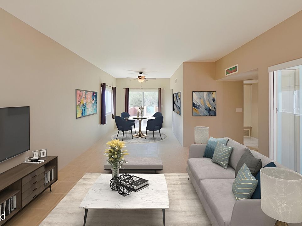 Retire in Style in this fantastic end-unit townhome. With NO GVR and a BRAND-NEW HVAC system installed in 2024, this property guarantees a truly relaxed living experience. Immerse yourself in its tranquil ambiance as you pass through the lovely courtyard, adorned with a charming Sonoran ocotillo pergola - the perfect spot to savor your morning cup of coffee. Step inside to explore this bright and welcoming 2-bedroom, 2-bathroom home with a double carport. It boasts ceramic TILE FLOORING and NEWER WINDOWS, throughout the home. The expansive living and dining rooms provide direct access to a private backyard, while the kitchen comes complete with modern appliances and plenty of counter space. The owner's suite offers a walk-in closet and a sliding door leading to the backyard. The ensuite bathroom is equipped with a walk-in shower for your convenience. Your guests will feel at home in the lovely guest bedroom and the guest bathroom with a tile shower-tub combo. Additionally, there is a laundry closet housing a modern washer and dryer. Relax and recharge in a spacious backyard featuring a porch, pavers and stunning natural desert views. Additional features include newer fans, smooth ceilings, and a storage closet in the 2-car carport. As a resident of the Villages of Green Valley, you'll have access to a recreational center boasting a pool, tennis courts, shuffleboard courts, pickleball, a library, and more. Plus, there's convenient guest parking next to the unit. GVR membership is available but not mandatory. All around a fantastic townhome that you cannot miss!