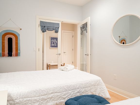 Three cozy bedrooms are smartly spaced across the two levels for privacy as needed. The bright and airy main en-suite king bedroom is upstairs featuring a gas fireplace and balcony overlooking the lake - a perfect spot to enjoy morning coffee or after-dinner drinks. The large bathroom has a walk-in shower, soaking tub, and closet for tucking away travel items. A workspace and seating area is located off the bedroom, ideal for virtual commuters and students needing to catch up on assignments. Two additional private bedrooms and a full bath with a walk-in shower are on the first level.
