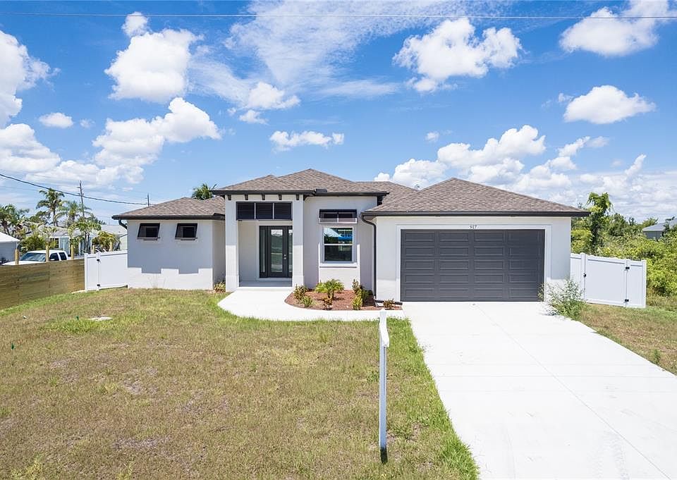 COMPLETED New Construction QUICK MOVE IN 1642 Semi-Custom WATERFRONT 3 BEDROOM, 2 BATHROOM home with DEN & with NEW DOCK and 13,000lb lift and ROOM FOR A POOL awaits new owners! Come see the progress of this fabulous project underway, being constructed by Charlotte Harbor Construction's Elevated Homes Series, with a beautiful layout including impact windows (back lanai will have shutters only), Bahama shutter and corbel details on the front exterior, tile floors throughout, a modern style with shaker white cabinets, and a shaker gray island, granite countertops, brushed nickel hardware, and more! Inside find a thoughtfully designed split floor plan with great high ceilings, 8' doors in the main living room area, and with the master bedroom off to one side with dual walk-in closets, and a great en-suite bathroom with tile/glass enclosure and dual sinks. Off the entry, a den area is perfect for flex space or an office and is open to the great room with sliding glass doors, and the kitchen with breakfast bar area, also connected to the dining area, all with fabulous water views! On the other side of the home, find the laundry room with sink/cabinet, and two guest bedrooms with shared bath with shower. This home also has a nice 2 car garage with epoxy finish on the floor. A boaters paradise, this area is great for fishing, and taking your vessel out through the lock to the harbor and Gulf of Mexico via the canal system. For the outdoor enthusiasts, enjoy great community bike paths, sidewalks, and parks, as well as nearby shopping, restaurants, and beaches. This home has it all! Call or stop by for details today!