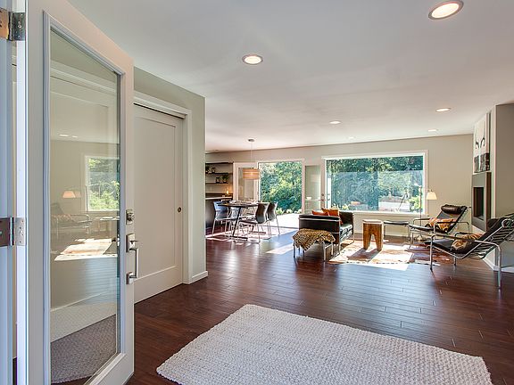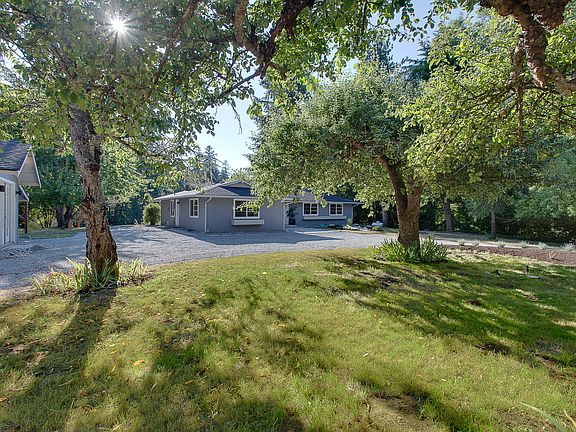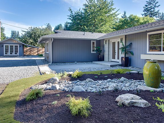 Remodeled single level home has tranquil views onto Fletcher bay enjoying the ebb & flow of the tide and a great bounty of birdlife. Tons of sunshine. West facing windows off the open concept living room, dining and kitchen open to a substantial patio. Natural waterside terrace for recreation, plus RV parking, mature fruit trees & insulated-powered outbuilding . Very private, like new waterfront rambler with gas fireplace, wine fridge, soft-close cabinets, and high efficiency heating/cooling.