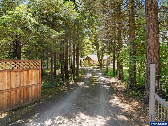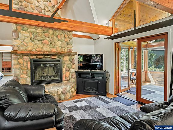 Home in McKenzie River valley on 1.35 acres w/ breathtaking views. Open-concept w/ vaulted, beamed ceilings, exposed trusses & hardwood floors. New ceiling fans equipped w/ remotes. New custom blinds. Living room w/ river rock fireplace. French doors to sunroom w/ wood plank high ceilings & access to deck. Updated kitchen, w/ dining area, island, pantry & skylight. Primary bedroom w/ skylight & private bathroom. 20 x 48 permitted, insulated RV garage/shop w/ separate gated driveway. High-speed internet.