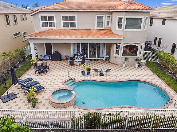 Your entertainment oasis awaits in the party-worthy paver backyard, seamlessly visible from the upgraded kitchen, breakfast area, and family room. This outdoor haven is adorned with a captivating pool and jacuzzi, creating the perfect backdrop for hosting gatherings and creating cherished memories.