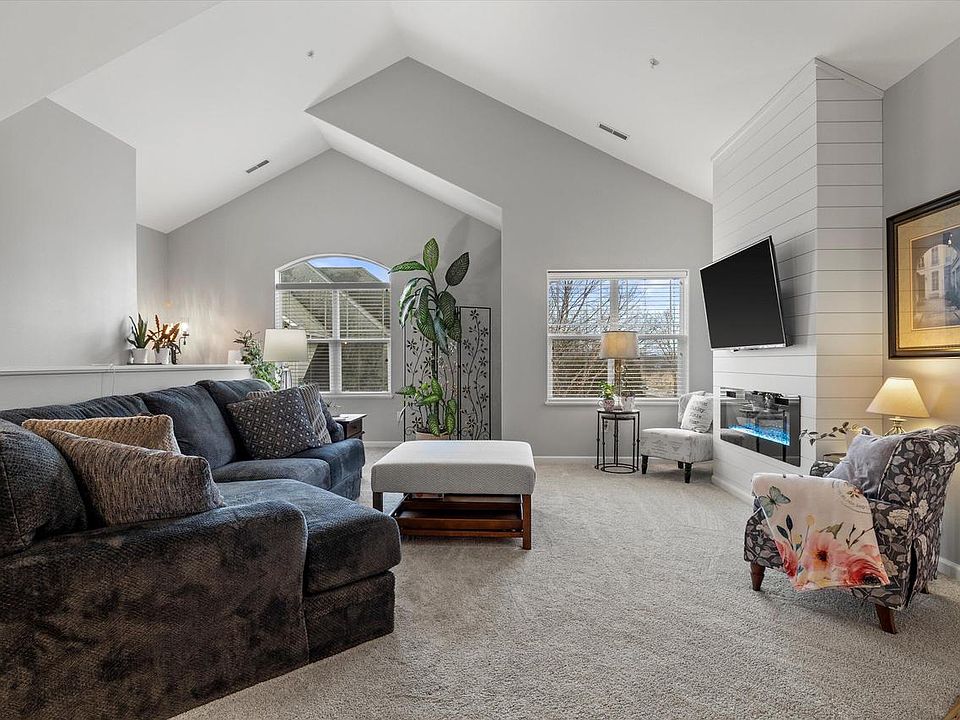 You will not find another one like this! Move right in to this completely updated, over 2000 sq ft condo. Vaulted ceilings, light and bright aesthetic - yet a homey feel. A custom floor to ceiling shiplap electric FP in living room will make you want to cozy up with a book from your bookshelf nook! Entertain effortlessly with ample seating around your custom built island, Corian counter tops & backsplash. Large primary suite with private bathroom, WIC and walk-through laundry! Massive family room, 2nd bedroom, 2nd full bath, covered balcony and finished closet for all your upper unit storage needs completes unit. Freshly painted, new carpet and new vinyl flooring throughout in 2020. New AC/Furnace 2020. Water heater 2023.