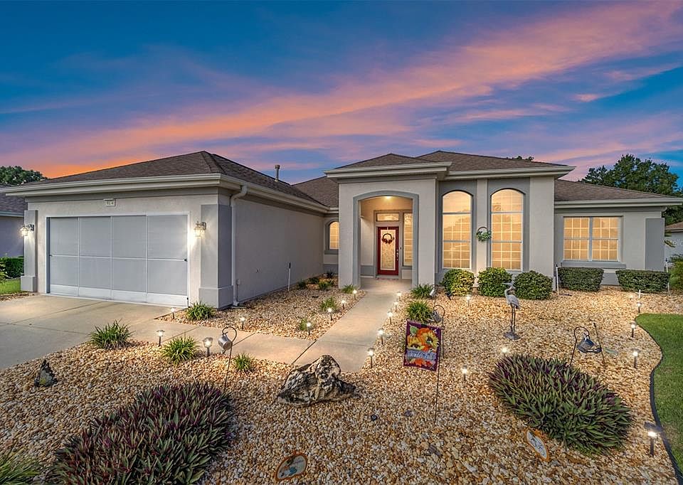 PRICE IMPROVEMENT!!!! Welcome to this EXCEPTIONAL SANIBEL BLOCK/STUCCO POOL HOME, located within OUTSTANDING DEL WEBB SPRUCE CREEK GOLF AND COUNTRY CLUB, in the neighborhood of Tamarron II. The heart of the home is the SPACIOUS KITCHEN, with TWO TALL ARCHED WINDOWS, top-of-the-line 2023 STAINLESS STEEL APPLIANCES(2023), GRANITE countertops(2023), NEW LIGHTING FIXTURES(2022), a closet PANTRY, as well as a stylish but functional BUILT-IN HUTCH in the EAT-IN DINETTE area with an ELEVATED CEILING. The hutch matches the LIGHT KITCHEN CABINETS of the cooking space. A large pass-through to the great room has room for seating at a BREAKFAST BAR. The home also features an OPEN FLOOR PLAN with HIGH CEILINGS, thoughtfully designed to meet all your needs. The open floor plan allows for EASY FLOW between the kitchen, dining and living room(GREAT ROOM) with CEILING FAN and NEW CHANDELIER, and LANAI to the inviting POOL! Step outside to your PRIVATE BACKYARD paradise through FULL SLIDERS. The fully ENCLOSED LANAI with 2 CEILING FANS, BLINDS, and UNDER HEAT AND AIR adds 280 sq.ft. of living area to the 1,973 sq.ft. It opens to the inviting HEATED (FILTER and HEATER NEW 2023) AND LIGHTED POOL with a surrounding BIRDCAGE. Landscaping for PRIVACY adds to a setting that's perfect for outdoor gatherings or simply unwinding after a long day! Zoysia grass. The PRIMARY BEDROOM is a true oasis with a BUMP OUT BAY WINDOW, complete with an EN-SUITE BATHROOM featuring a vanity with make-up area, and a ROMAN WALK-IN SHOWER with BENCH SEATING. The WALK-IN CLOSET offers ample storage space. This SPLIT BEDROOM FLOOR PLAN features 2 SPACIOUS BEDROOMS, 2 LUXURIOUS BATHROOMS, and a 3RD ROOM WITHOUT A CLOSET(Den/Office), currently being used as a GUEST BEDROOM. Your options for this room are endless. CEILING FANS are in all three rooms. A separate OFFICE has a BUILT-IN DESK WITH SHELVING and a CEILING FAN, leading to the TWO-CAR GARAGE. There you will find an EPOXOY FLOOR, RUBBER FLOORING MATS, LAUNDRY with NEWER DRYER(2022), WATER SOFTENER(2024) and plenty of storage space throughout. A NEW GARAGE DOOR OPENER has been installed(2024) with screen sliders. NEW UPGRADES GALORE include the EXTERIOR being PAINTED(2020) and INTERIOR PAINTED a soft neutral color throughout(2024), LUXURY VINYL FLOORING(2022) in all rooms with the exception of CARPET(2022) IN 3 BEDROOMS. No tile in this home! DESIGNER LEADED GLASS(2023) has been installed in the front door along with an ENCLOSED BLIND (2023), NEW KITCHEN AND DINING ROOM LIGHTING FIXTURES(2022), and CLOTHES DRYER(2022). Bathroom TOILETS have been replaced (2022). CURB APPEAL is not lacking with plantings, and newer LANDSCAPING(2020) including LOW MAINENANCE DECORATIVE STONE. Zoysia Grass. Just walking distance to the FITNESS CENTER. Enjoy all the amenities in this wonderful community, including three Resort Style Pools, two outdoor and one indoor, each with its own hot tub. Enjoy the on-site Restaurant and Golfing. The Community Center houses a ballroom, and many rooms available for the over 70 chartered clubs and activities. Something for everyone - tennis and pickleball courts, softball field, billiard room, shuffleboard, bocci ball, horseshoe pits, basketball, sand or water volleyball, walking trail, and a dog park. This Florida living in this community is truly AMAZING! *The HVC SYSTEM INSPECTED 9/24. POOL INSPECTED 9/24. **A NEW ROOF WILL BE INSTALLED PRIOR TO, OR INCLUDED WITH THE SALE OF THIS HOME AT CLOSING.