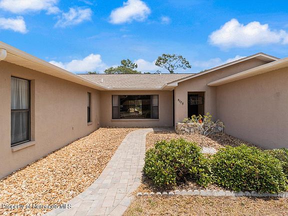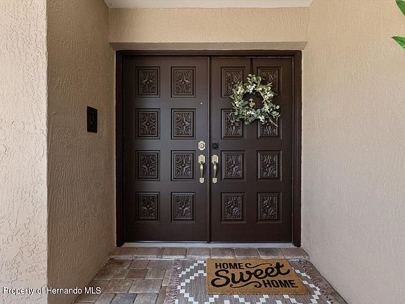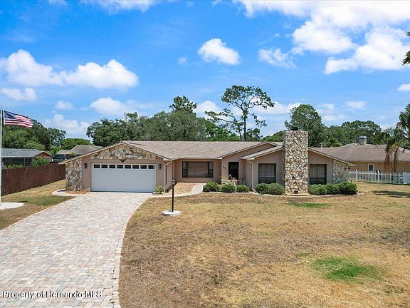 Active Under Contract - Accepting Back Up Offers. Welcome to Lavina Lane! This 3 bedroom, 2 bath ranch style POOL home is located in the heart of Spring Hill and has so much to offer! The home sits on over a quarter acre lot. A gorgeous paver driveway and walk way will lead you into the detailed, double front doors. You have a view of the pool through the sliding glass doors once you walk inside. To your right is the large step down family room. This living space showcases a stunning stone fireplace, wood beams, and a wet bar making it the perfect space for entertaining. The primary bedroom is also located on this side of the home and is generous in size. It has a spa-like, newly renovated bathroom featuring a new vanity with dual sinks, marble countertop, freestanding garden tub & walk-in shower with grab bars installed on both. Moving over to the left side of the home you'll be in awe by the modern, updated kitchen with beautiful granite countertops, new white soft closing cabinets, and glass tile backsplash. The stainless steel appliances include a Bosch dishwasher, built in microwave above the oven, and built in stovetop with range. The kitchen is open & shared with the formal dining & even a breakfast bar area! The two mid-sized guest bedrooms share a bathroom that has been modernized and has a convenient entry into the shower from the lanai to refresh after a pool day. The pool has multiple access points throughout the home. Once you step out the sliding glass doors you are captivated by the beautiful 30x15 SCREENED IN pool. Pool depth slopes from 3 to 8 feet, has a surrounding paver deck, a diving board, and a unique lighted stone WATERFALL fountain! The covered lanai is shaded, perfect for mounting a TV, and enjoying the Florida days! This home has been well maintained, septic just pumped, roof replaced in 2019, new water heater in 2017 & HVAC last replaced in 2008 with all major parts replaced over recent years. As an added feature this home has an irrigation system on a well, 2 car attached garage, and an indoor dedicated laundry room. Summer is right around the corner, don't miss out on this perfect pool home to cool off in!