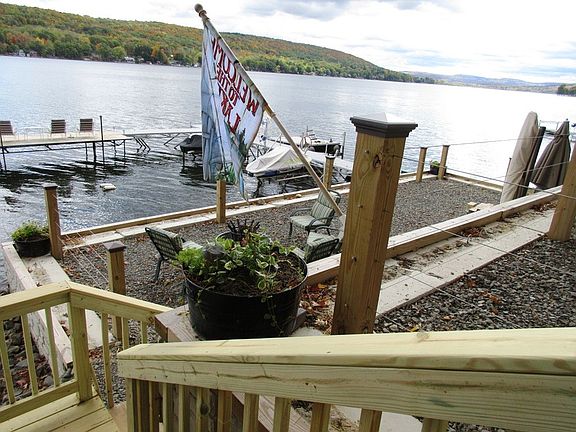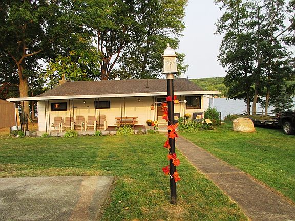 COME HOME TO WANETA LAKE WHERE A RANCH STYLE COTTAGE AWAITS YOU! One large bedroom possible split to make 2. A large bathroom off the Bedroom area. A tiered lake front patio area ready for your lakeside entertaining and enjoyment. The possibilities are endless. Inside the cottage the kitchen is very workable and sunny. The kitchen opens to a double living room complete with a fireplace on one end...fireplace has a pellet stove insert for cozy times. Off the living room is an enclosed sunroom that doubles as a dining area. The sunroom offers a beautiful view of the lake and the surrounding area. A covered patio porch for more picnics, wine time and sunsets. A large side yard with access driveway to the lake, plenty of parking, a one car garage and a shed for storage complete the property. Come take a look!