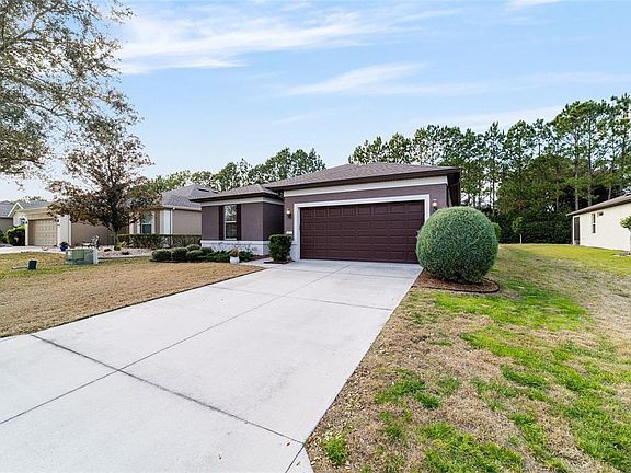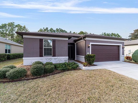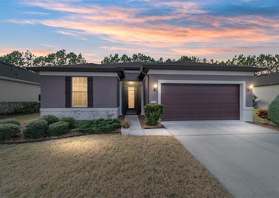 Welcome To Stone Creek! A gated, 55+ active adult community located in Ocala FL - horse capital of the world! Begin your next chapter of life in this beautifully upgraded Summerwood model with a large, private back yard. The premium lot has no neighbors in the rear and room for a pool. This home was built in 2019 with careful attention to detail, starting with the insulated block construction for energy efficiency and structural strength. Thoughtfully designed with tandem parking in the garage allowing for two cars AND a golf cart, or extra space for storage or a hobby space. Entering the home you will be welcomed by a screened in front porch, leading to a designer full-lite door, that opens to a functionally designed split-floor plan. High-end luxury vinyl flooring leads you into the living space where you will find an abundance of natural light and tasteful upgrades including custom window treatments matching the accent walls, additional can lighting, and designer light fixtures. The kitchen boasts stunning 42 inch cabinets with crown moulding, under cabinet lighting, pull-out drawers, custom tile backsplash, upgraded granite counters, and high-end appliances. In the primary suite you will find similar custom window treatments, a fandelier (if you have never seen one, come check it out!) and an ensuite bath complete with a tiled walk-in shower, granite counters, dual sinks, cohesive paint colors, and a very large walk-in closet. This home really allows you to soak up the florida climate and great weather.... The sliding, stackable, doors disappear into the wall and open up to a screened in lanai complete with custom shades to adjust the amount of light to your preference. No details were spared when designing this home, it is move-in ready and the perfect place to enjoy your retirement. Contact the listing agent for a full list of upgrades or to schedule a showing. Furnishing negotiable separately.