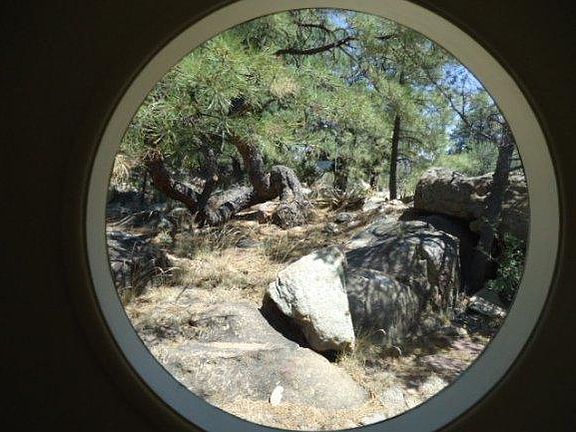 Beautiful refishished original wood floors throughout. Unique home in a very private serene setting. Decorative fireplace. Circular view window from dining room with view of ponderosa pines, boulders, birds and wild life. Wonderful open front patio with view of pines.
