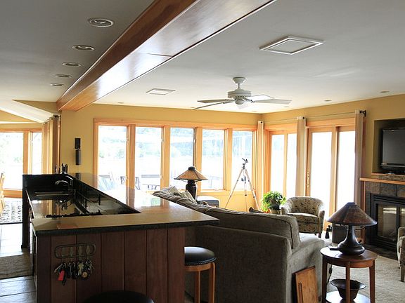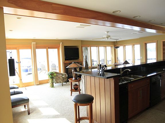 Enjoy spectacular sunsets from this unique 2700 square foot contemporary lakefront home on its own point on the southeast shore of Cayuga Lake. Very private with four bedrooms, 3.5 baths, open great room with gas fireplace, and vaulted ceilings. Lake views from every room! Custom cherry Plato kitchen with granite countertops, raised bar, gas cooktop, double wall ovens, and pantry. Amazing master suite with walk in closet, large dressing/lounge area, fireplace, and private porch. Spacious master bath with whirlpool, walk in shower, and double bowl granite vanity. Built in 2001, with radiant floor heating, central AC, 2nd floor laundry, and whole house vacuum system. Appliances included and most furnishings are on offer. Oversized attached one car garage and a 12 X 12 freestanding insulated workshop/bunkhouse. With over 160 feet of lake frontage, 1000 square feet of patio and deck, 50 foot dock, and generous parking it is great for entertaining. Located in the town of Ithaca two miles from Cornell, walking distance to middle and high schools, and a quick stroll to Stewart Park. Adjacent buildable lakefront lot with excellent water views is available as a right of first refusal to home buyer. Showings by appointment beginning May 2. $999,999. Buyers agents welcome at 1.5%