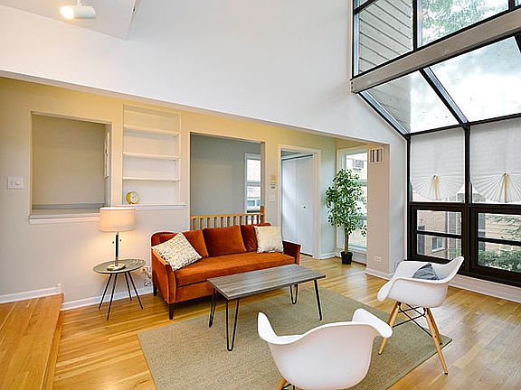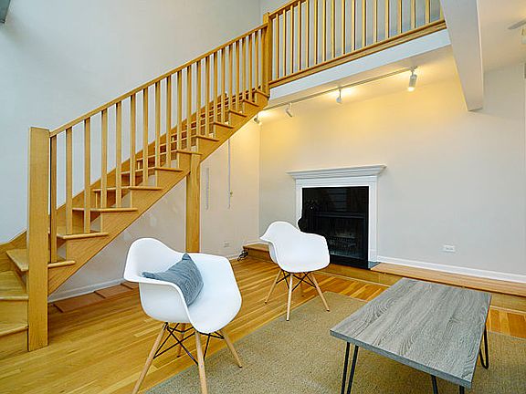 Bright two story unit near everything! Unique floor plan! Two bedrooms, in unit laundry, parking and fireplace too. Hard wood floors throughout, central air conditioning and large bedrooms. Nearly 1200 square feet in a small intimate building just steps to Starbucks, El, Metra, Northwestern shuttle and beach!