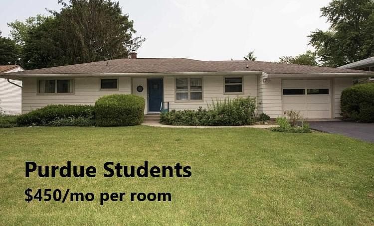Welcome Purdue Freshman. Forget the dorms and rent a room in a house walkable to campus. Don't want to walk? No worries. The bus picks up from the neighborhood. Enjoy your own private room with a keypad lock on the door. Play cornhole in the large backyard. Don't go home to do your laundry, use the machines, free of charge in the basement. Don't bring your own couch, kick back on the couches provided and watch any sports game direct tv has to offer. NFL, NBA, MLB tickets on the 65" tv. Ping pong table in the basement as well as an NBA Jam Arcade machine. Multiple living spaces. You're just minutes away from securing your room in this great campus house. Interested? Fill out an application and let's get you moved in. $475/basement room, $550 for the master bedroom (private bathroom). The other 2 upstairs bedrooms are already rented. Garage parking is available on a first come/ first serve basis for $50/mo. Also, $40/week will be paid to mow the grass if you want to minimize expenses. One year lease required. Security deposit($1000), plus 1st/last months rent due at signing. Requesting Purdue students only.