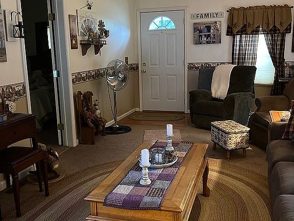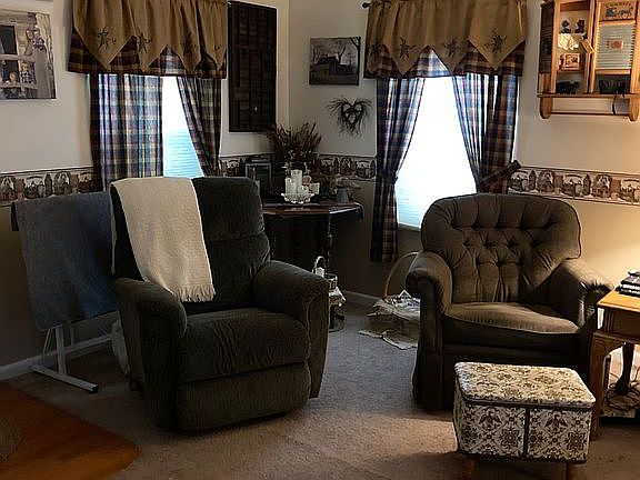 Entrance: New cement sidewalk leads to raised deck in great condition. Living Room/Dining Room: These rooms are open to each other. Painted walls, lots of replacement windows and natural light, cream carpet. Kitchen: Oak cabinets, stove and refrigerator included. Stainless steel sink, laminate floor. Bedroom: White walls, white doors and trim, cream plush carpet, ceiling fan. Bath: White fixtures, vinyl tile floor, storage space. Bedroom: Cream walls, white wood work, cream plush carpet. Basement: Dry basement is open and has GFA and Central Air, gas water heater and hook ups for washer/dryer. Cement sidewalks to front and back door, gravel parking space.