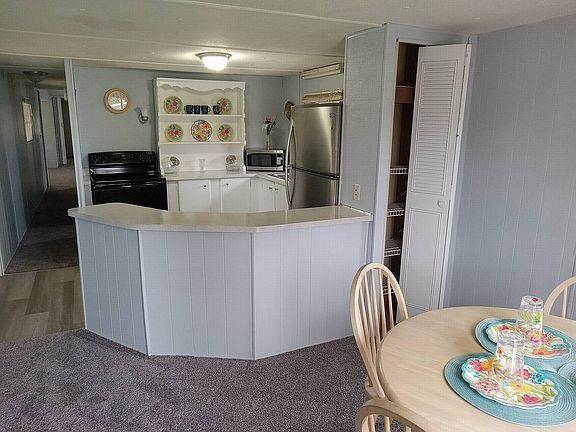 2 bedroom/ 1.5 bath in 55 community next to a lake. Features a Florida room with hookups for laundry, carport, shed, newer A/C and duct work, Freshly Painted and carpet, kitchen with a breakfast bar, and a separate dining room.