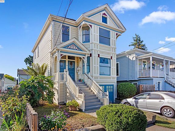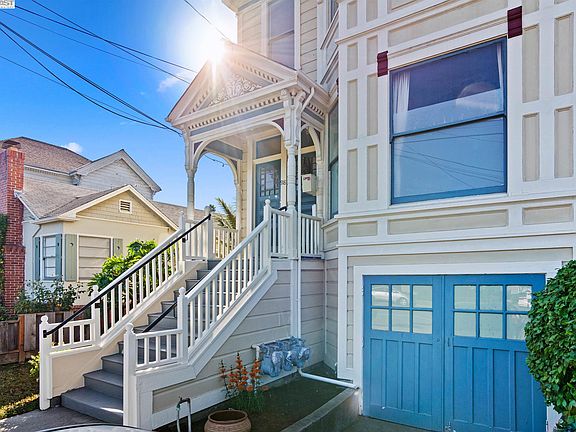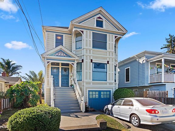 This elegant Marcuse & Remmel Victorian tri-plex is located on a street with beautiful turn-of-the-century homes in central Alameda. Vacant upstairs unit B is a light-filled beauty featuring 2 BR and 1 BA with newly refinished wood floors, tall sash windows with wavy glass, ceiling medallions, decorative trim and period light fixtures. The front living room and bedroom have an expansive view out to downtown Oakland and a 2nd large sunny bedroom is located off the hallway. A roomy kitchen has plenty of space for a gourmet kitchen remodel. The bathroom has an original marble-topped sink and claw-foot tub. A storage room behind the kitchen opens to a back stairway leading to a spacious back yard and the rented Unit C studio cottage with its own private fenced yard. The Unit A apartment below retains many of the original Victorian features including wood floors, ceiling medallions, and signature Marcuse & Remmel stained glass window. This rented unit has 1 BR and 1 BA. Beneath the two apartment units are a full garage, laundry area and large amount of storage. This vibrant neighborhood includes bus transit to Oakland, SF and beyond, excellent school, grocery store, bi-weekly farmers market, close proximity to parks and beaches, & the vibrant shops and restaurants on Webster Street.