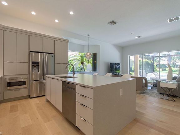 Nestled in a manicured lakefront southern exposure setting, this 2020 renovated (see update overview attached) pool home features sleek lines of contemporary design with a nod to the glamorous life. Luxurious finishes include wide plank maple flooring throughout bringing a modern, airy feel to every room. The 4 baths are dressed in sculptural wall tiles accented with Atlas Concord polished terrazzo floors & Silestone quartz tops creating simplicity & refinement. The dual tone island kitchen features Silestone suede quartz tops, copious drawers, induction & convection range & a hidden hood for the streamlined minimalist unmistakable aesthetic. Modern lighting fixtures set the mood for perfect evenings. The charming lakefront scenery is punctuated by a clear view pool enclosure making outdoor therapy the best part of the day. The Vineyards membership is optional featuring a world class golf & country club experience + a 15,000 SF fitness center all within minutes to downtown Naples, world-class shopping, dining, and the beach are at your fingertips. It is no wonder that people travel from all over the globe to live in Naples, one of the most beautiful spots in the world.