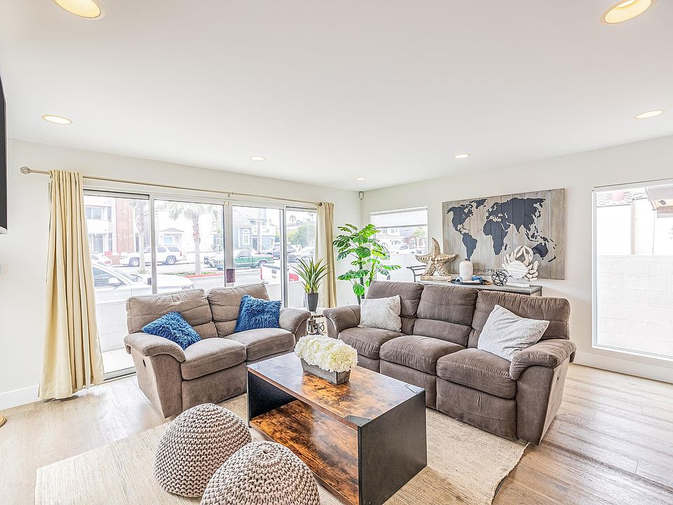 Welcome to Seaside Style, your breezy retreat nestled on the picturesque Balboa Peninsula. With the Pacific Ocean on one side and Newport Bay on the other, you'll find yourself in a prime spot to soak up the sun and sand, with Newport Beach and 10th Street Beach both just a short stroll away. Step inside to a bright, contemporary haven with an open layout designed for effortless connection. The living room, bathed in natural light, offers dual sofas, a TV, and a cozy fireplace, creating the perfect spot to unwind after a day of seaside adventures. Gather around the dining table with seating for six, or enjoy casual meals at the kitchen barstools in the fully equipped kitchen. Seaside Style boasts three comfortable bedrooms, each offering a serene escape. Two bedrooms feature en-suite bathrooms with showers, ensuring plenty of space and privacy, while the bunk room is perfect for kids or groups seeking flexible sleeping arrangements. The spacious rooftop is a highlight, offering outdoor seating and a grill for memorable alfresco dining with incredible sunset views. Additional conveniences include in-home laundry and easy parking, making your stay as relaxed as possible. Guests have access to a 24/7 support team and a tech-enabled concierge to book services such as fridge stocking, mid-stay cleanings, and private chefs. Experience the best of Newport Beach from the comfort of Seaside Style, where beachside living meets modern comfort. This coastal city has the largest recreational harbor on the West Coast and is known for its amazing beaches, parks, restaurants, and outdoor shopping centers. The living is easy here and it often includes bike rides along the boardwalk and watching pros surf some of the biggest swells in Southern California at The Wedge. Take the ferry to Balboa Island for the best seafood in the area and to ride the historic Ferris wheel at everyone's favorite old-school amusement park. Local attractions include Balboa Peninsula, Fashion Island Shopping, Balboa Surf 7 Style for renting bikes and paddleboards, The Market for trying the Reuben Sandwich, Balboa Fun Park, Corona Del Mar Beach, Whale Watching, Newport Pier, Gondola Adventures, and Crystal Cove Park. Occupancy includes an additional two beyond bed count. Trifold floor mattresses and additional linens can be provided upon request. Pets are not allowed in this home. If undisclosed pets are brought into the home, there is a fine of $500 per pet. Parking is available in designated property parking locations only. This is a smoke-free property. Violation of the no-smoking policy will result in a $300 smoking fee and liability for any fire or property damage costs. Occupancy limits and quiet hours from 9pm to 8am are strictly enforced. No speakers or sound systems are provided for use in the property. Violation of any noise ordinances will be subject to fines that can reach up to $10,000 per violation. Events or parties are not allowed without prior written approval and an additional fee. Any unauthorized parties or events will be shut down and a fine will be assessed. IDs will be requested for verification after booking.